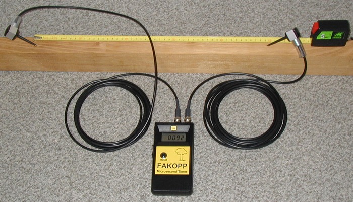 Fakkop微秒計設(shè)計用于測量樹木或木材中應(yīng)力波的傳播時間。通過錘擊觸發(fā)傳感器產(chǎn)生信號,然后由主機顯示所測量的傳播時間。通過測量兩個傳感器之間的距離,可以計算出速度,用來檢測兩個傳感器之間隱藏的腐朽區(qū)域或孔洞,或者預(yù)測材料的剛度。
